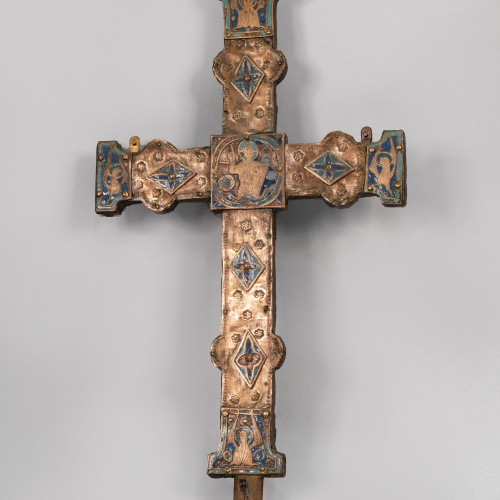 Mare de Déu de mig cos sosté l'Infant a la seva falda acompanyats per sant Joanet. Aquesta és la descripció que també apareix al catàleg de 1906. Curiosament, en el catàleg de 1936 ja no s'esmenta el sant Joanet, i tampoc surt a les fotos en B/N antigues que tenim, realitzades entre 1953-1955. En una restauració iniciada el 2003, però no acabada, va tornar a sorgir el profeta. La Mare de Déu porta els cabells llargs amb un vel transparent i un nimbe estrellat. Vesteix una camisa blanca prisada amb una sanefa al coll, un vestit vermell per sobre d'aquesta amb un escot en quadre i una mena de faldilla verda a sota. Sobre la màniga de la camisa, creant la unió amb el vestit, porta un aplic amb una sanefa daurada. Aquesta roba es tracta d'una moda que arriba d'Itàlia i que es dóna entre 1490 i 1540. D'altra banda, el Nen Jesús es troba sobre la falda de la Mare de Déu, i està completament nu assegut sobre una tela de color ocre. L'Infant té els cabells rossos, arrissats i també va nimbat; a més, està ensenyant la planta del seu peu esquerra. El sant Joanet que es troba a la part dreta del quadre, situat lleugerament darrera de les dues figures esmentades, també va nu i porta un estàndard. La Mare de Déu toca el peu dret al Nen Jesús i mira directament a l'espectador, mentre que l'Infant mira a la seva esquerra, possiblement a la figura del sant Joanet que, alhora, aquest també el mira. El fons està compost per unes cortines de color verd, potser afegides, perquè amaguen el daurat. L'obra és de força qualitat, però d'un pintor desconegut, segurament hispà del segon quart del segle XVI, d'acord amb el tipus de roba que porta i l'estil pictòric d'aquella època. De tota manera, el catàleg del 1906 apareix atribuïda al pintor Giulio Romano, deixeble de Rafael; i en el catàleg del 1936 surt citada com una obra anònima d'escola italiana.