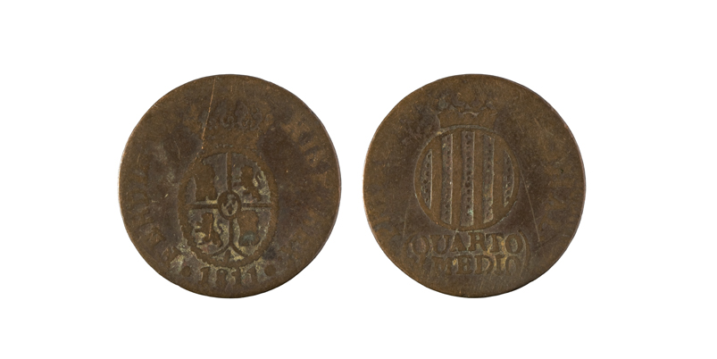 Escut coronat de Catalunya, arrodonit - a sota i a dins d’un parèntesi, QUARTO / Y MEDIO