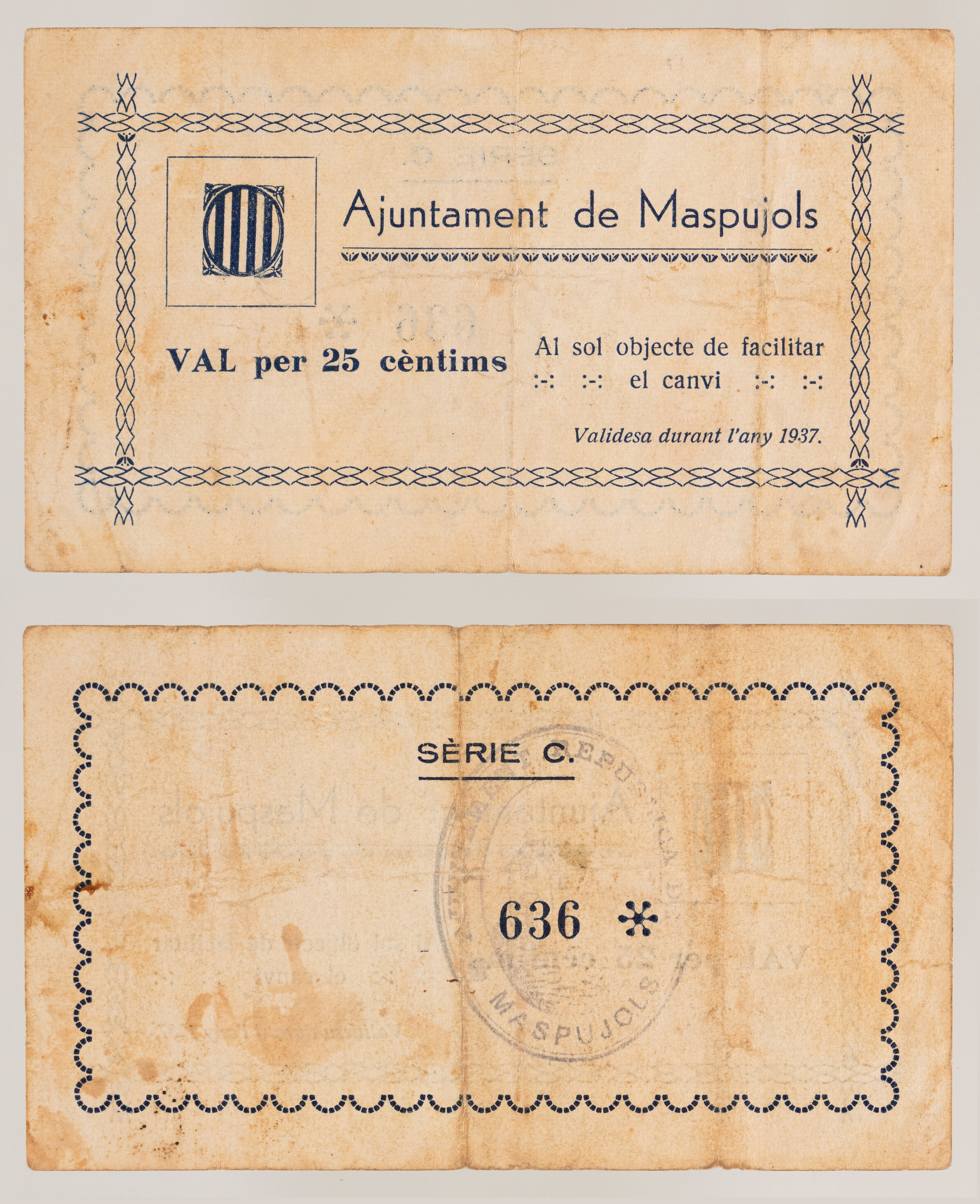 AJUNTAMENT DE MASPUJOLS/ VAL PER 25 CÈNTIMS / AL SOL OBJECTE DE FACILITAR / EL CANVI/ VALIDESA DURANT L'ANY 1937