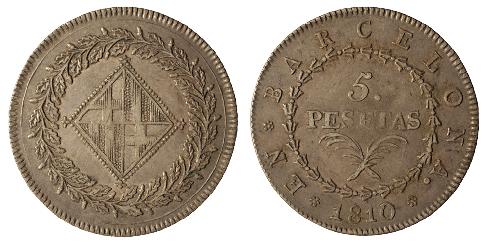 En el camp i dins d'una orla de 22 rosetes, 5. / PESETAS - a sota dues palmes entrelligades