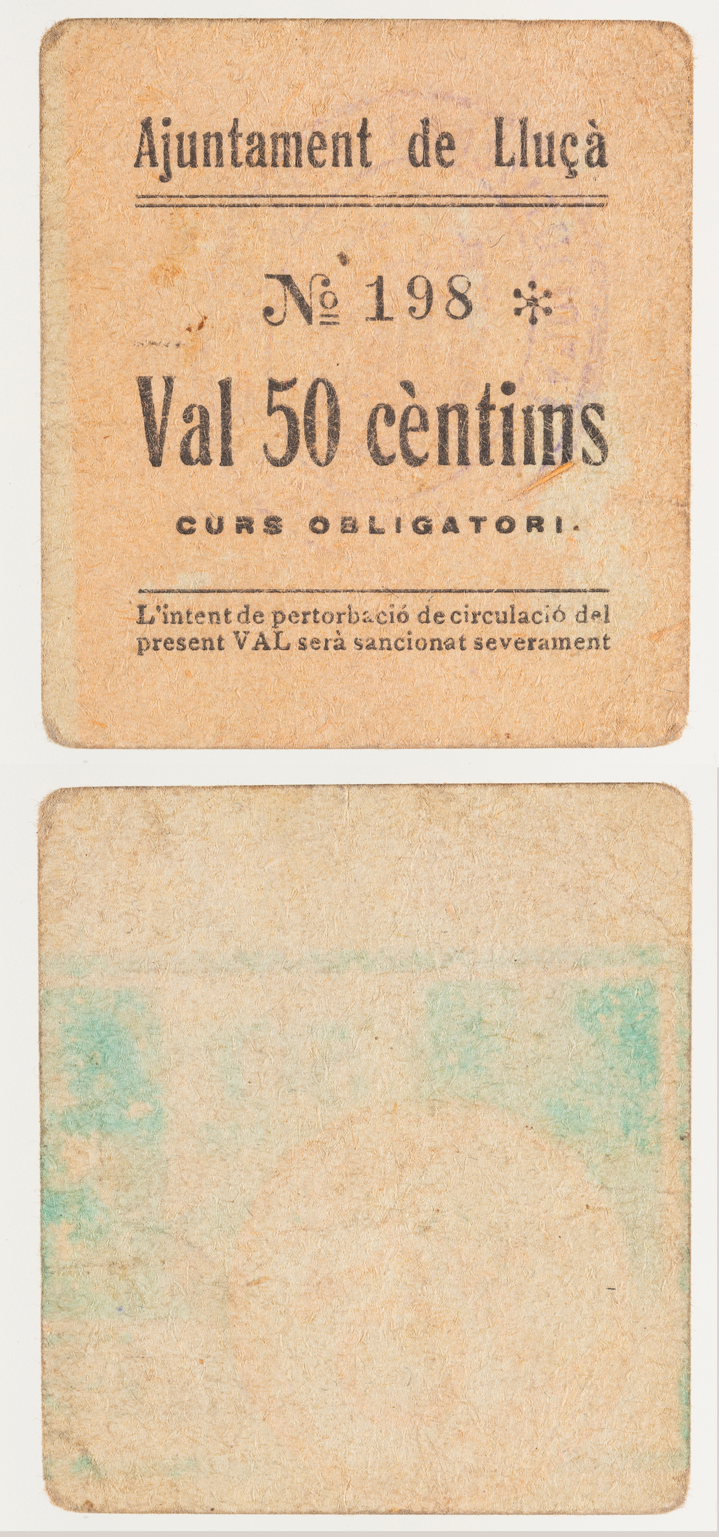 AJUNTAMENT DE LLUÇA / VAL 50 CÈNTIMS / CURS OBLIGATORI / L'INTENT DE PERTORBACIÓDE CIRCULACIÓ DEL / PRESENT VAL SERÀ SANCIONAL SEVERAMENT