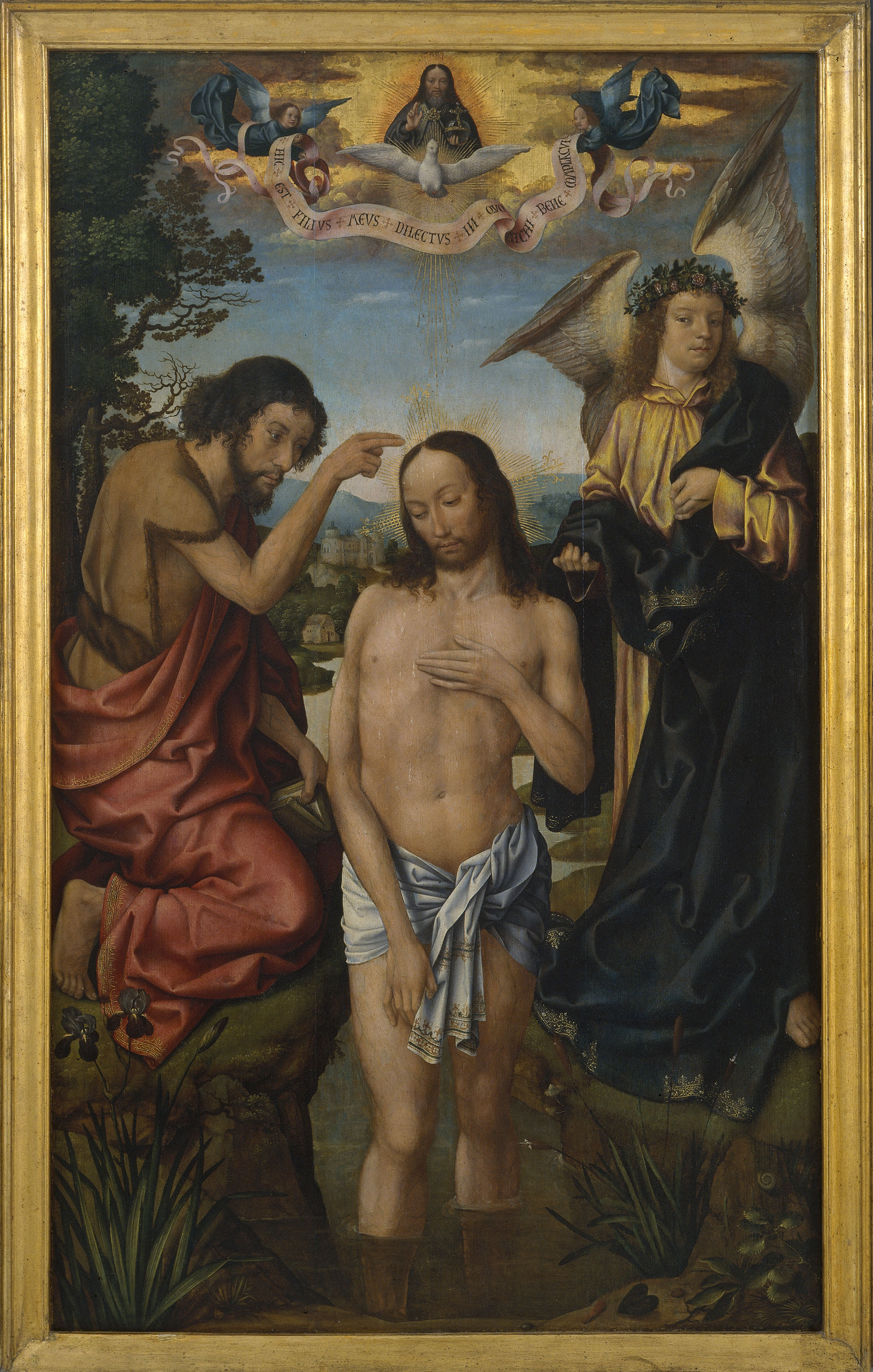 En el compartiment central hi ha el Bateig de Crist per sant Joan Baptista acompanyat per l'arcàngel Miquel, també present en el batent esquerre en el moment del pesament de les ànimes, mentre al batent dret hi ha un episodi de l'hagiografia de sant Francesc d'Assís. A la part exterior de les dues portelles apareixen les figures de l'arcàngel Gabriel i la Mare de Déu, en el moment de l'Anunciació. El programa representat gira al voltant de la idea de la redempció i de la renovació en la fe que suposa l'acte del baptisme. Per la mida de l'obra i per l'escut heràldic que hi ha a l'angle superior dret d'una portella, es tractaria d'un encàrrec privat, destinat a presidir una capella familiar en un temple. Des del punt de vista formal, l'obra és una manifestació paradigmàtica del treball del Mestre de Frankfurt, pintor flamenc que deu el seu apel•latiu a dos tríptics que es conserven en aquesta ciutat alemanya. La plàstica de l'artista empra solucions i fórmules eclèctiques: la composició de la taula central deriva d'un gravat de Martin Schongauer, i recorda obres de Gerard David; la tipologia de l'arcàngel Gabriel deriva de models gestats en el taller dels germans van Eyck, i que també fou reinterpretat per Roger van der Weyden i el Mestre de Flémalle.