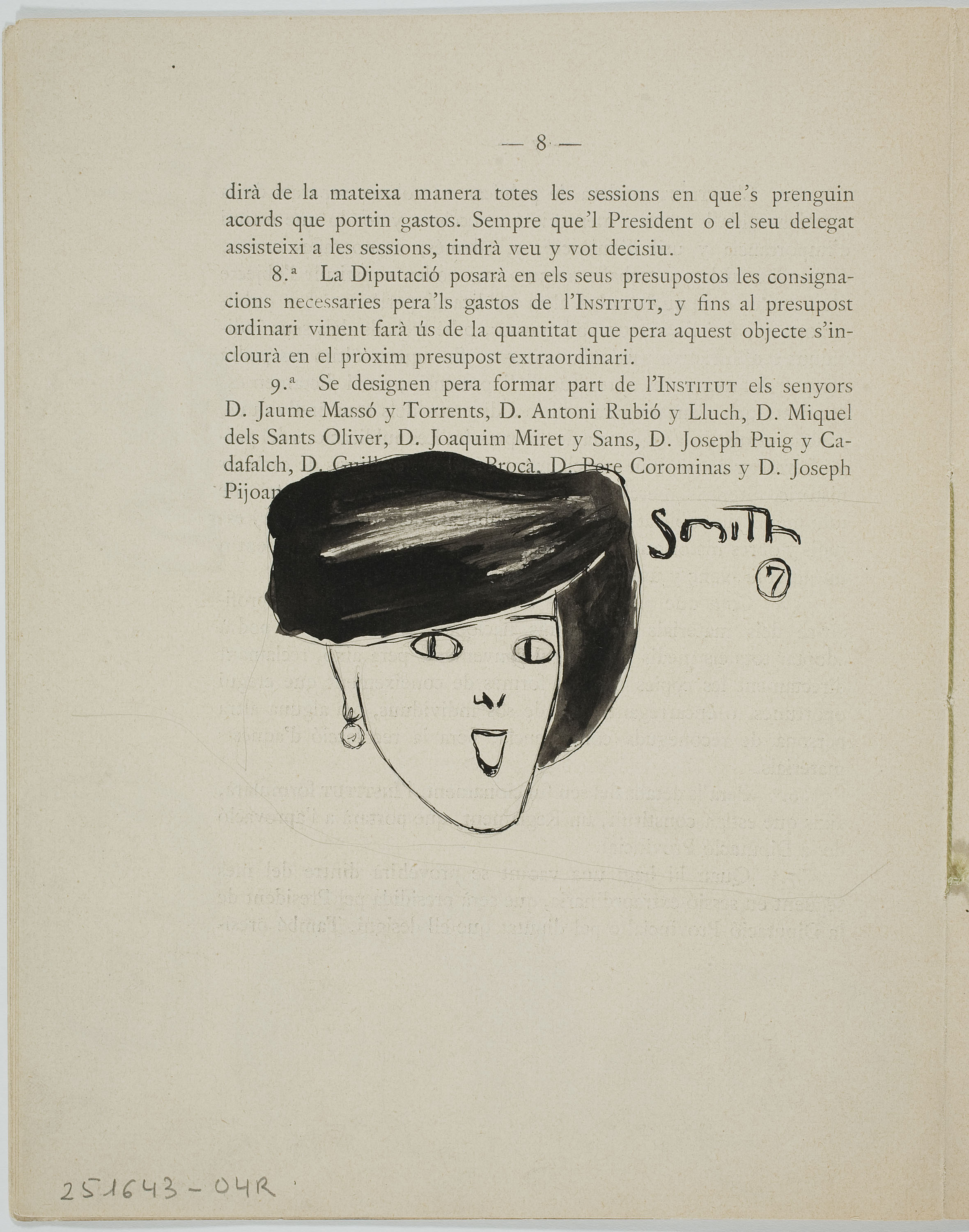 Cinc caricatures marginals al «Reglament interior de l'Institut d'Estudis Catalans» (anvers) / Retrat femení al «Reglament interior de l'Institut d'Estudis Catalans» (revers)