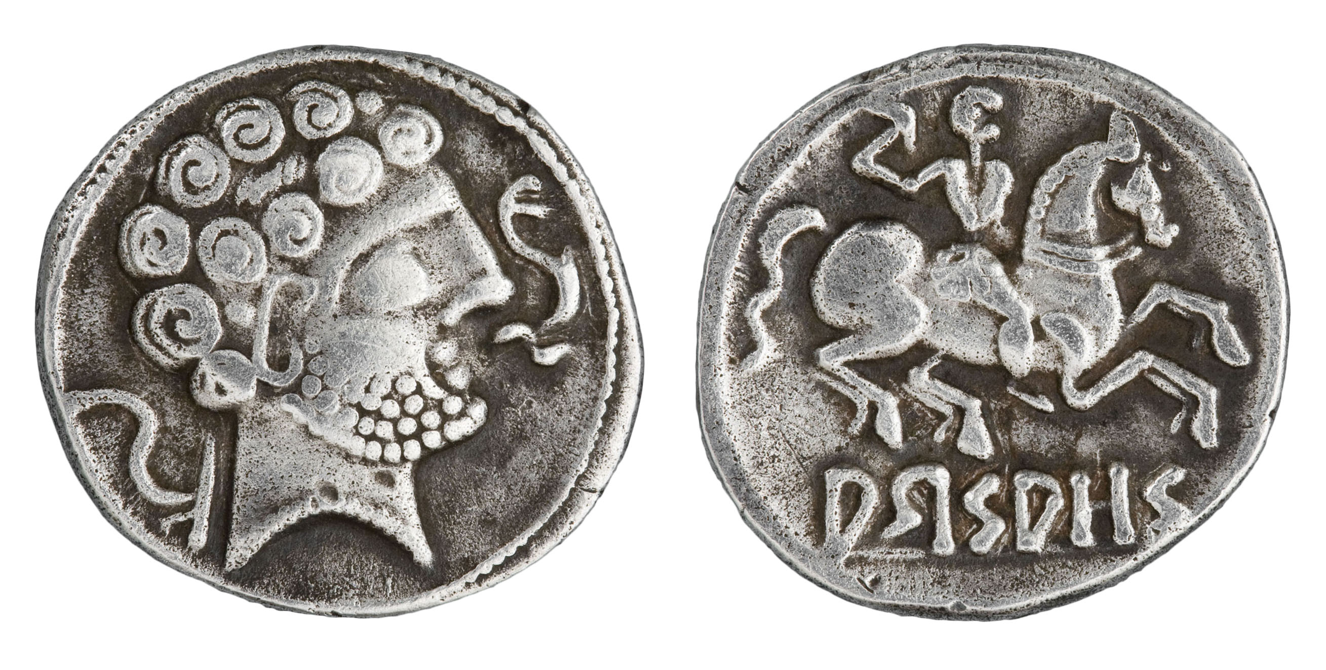 Cap barbat amb pentinat de pocs rínxols en forma d'espiral, collaret i torques, a la dreta - al davant, dofí - al darrere, arada.