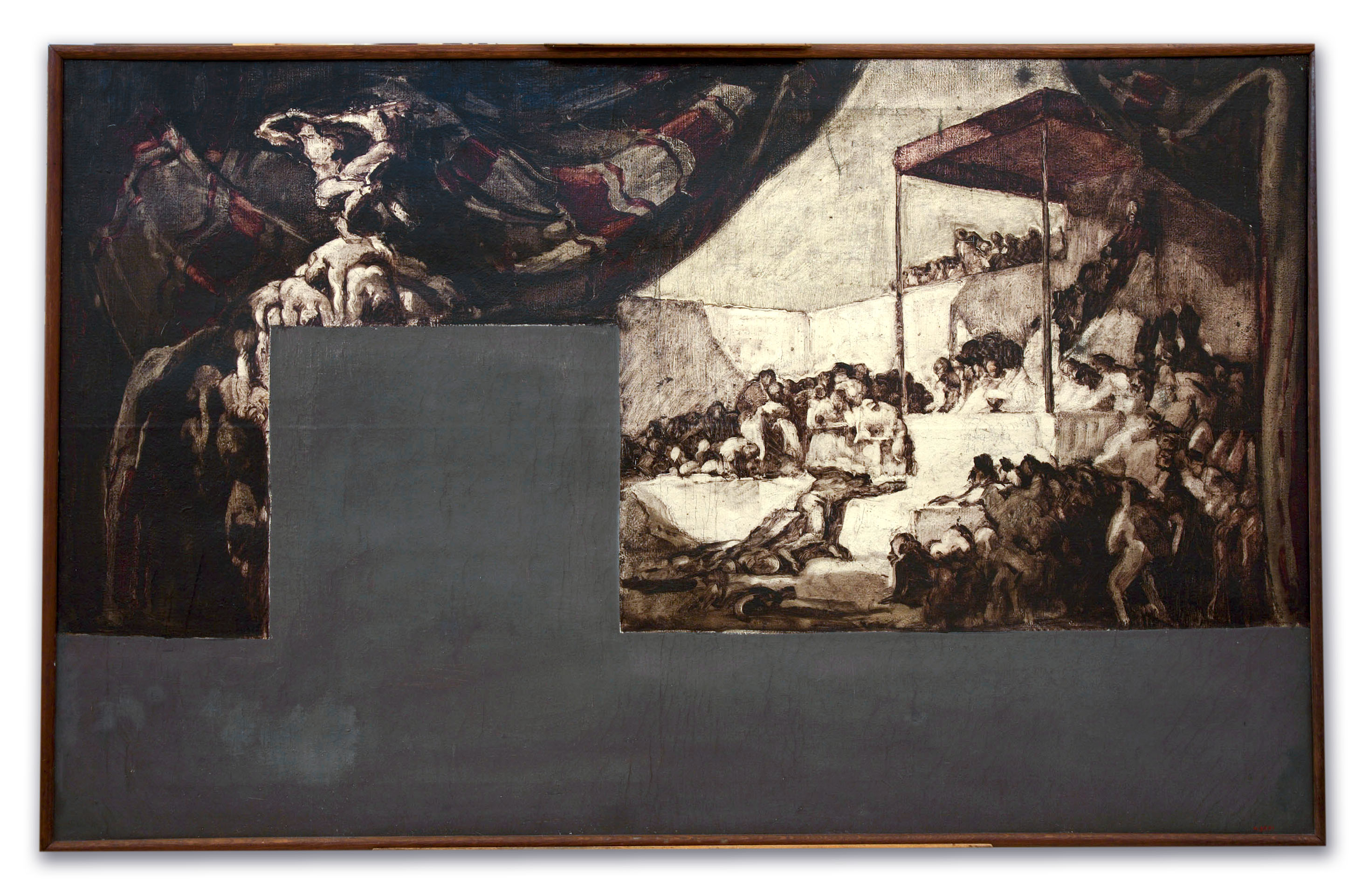 Oli sobre tela amb sèpia, gris i carmí sobre argent