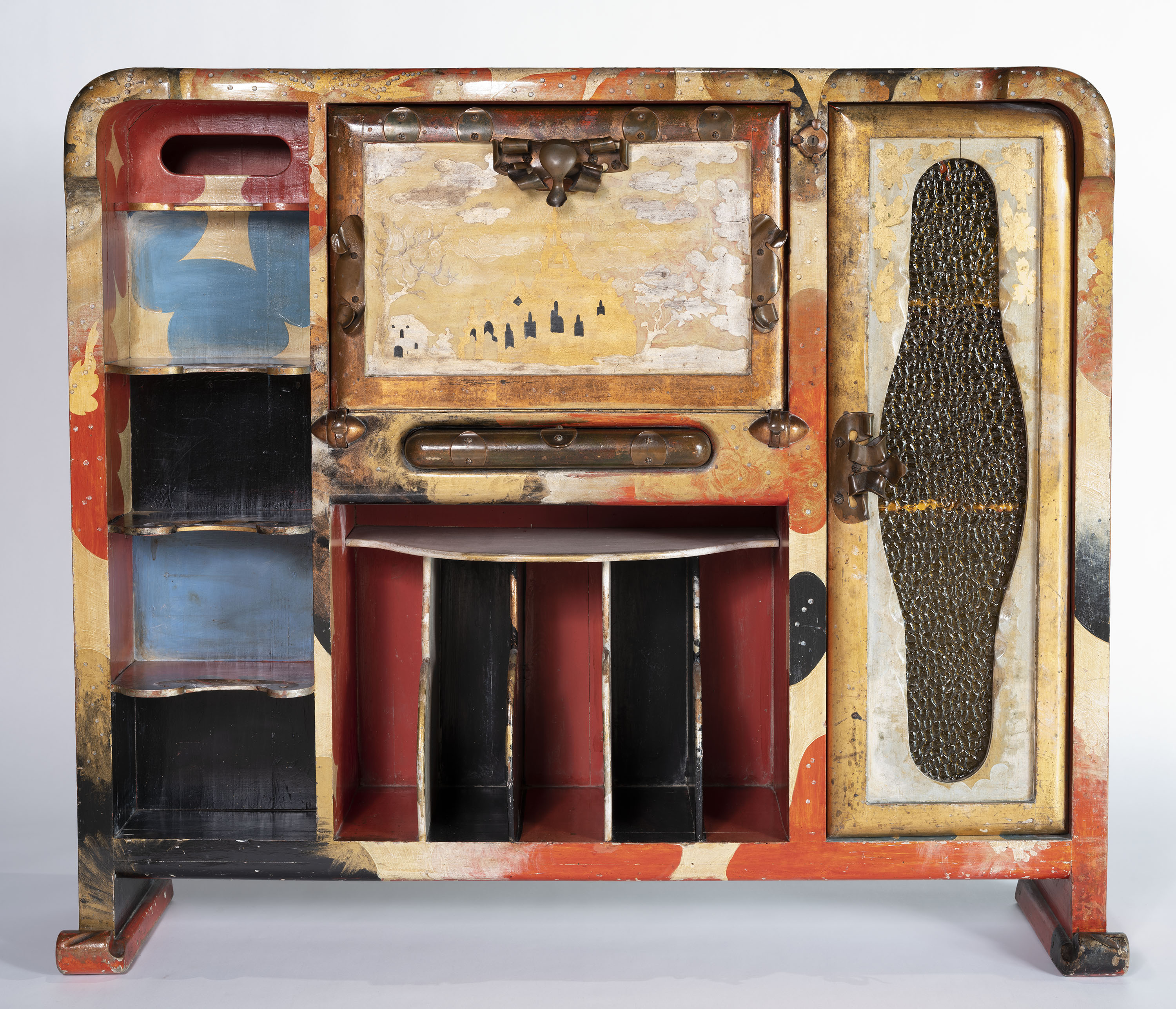 Fusta de pi lacada i policromada, metall i vidre