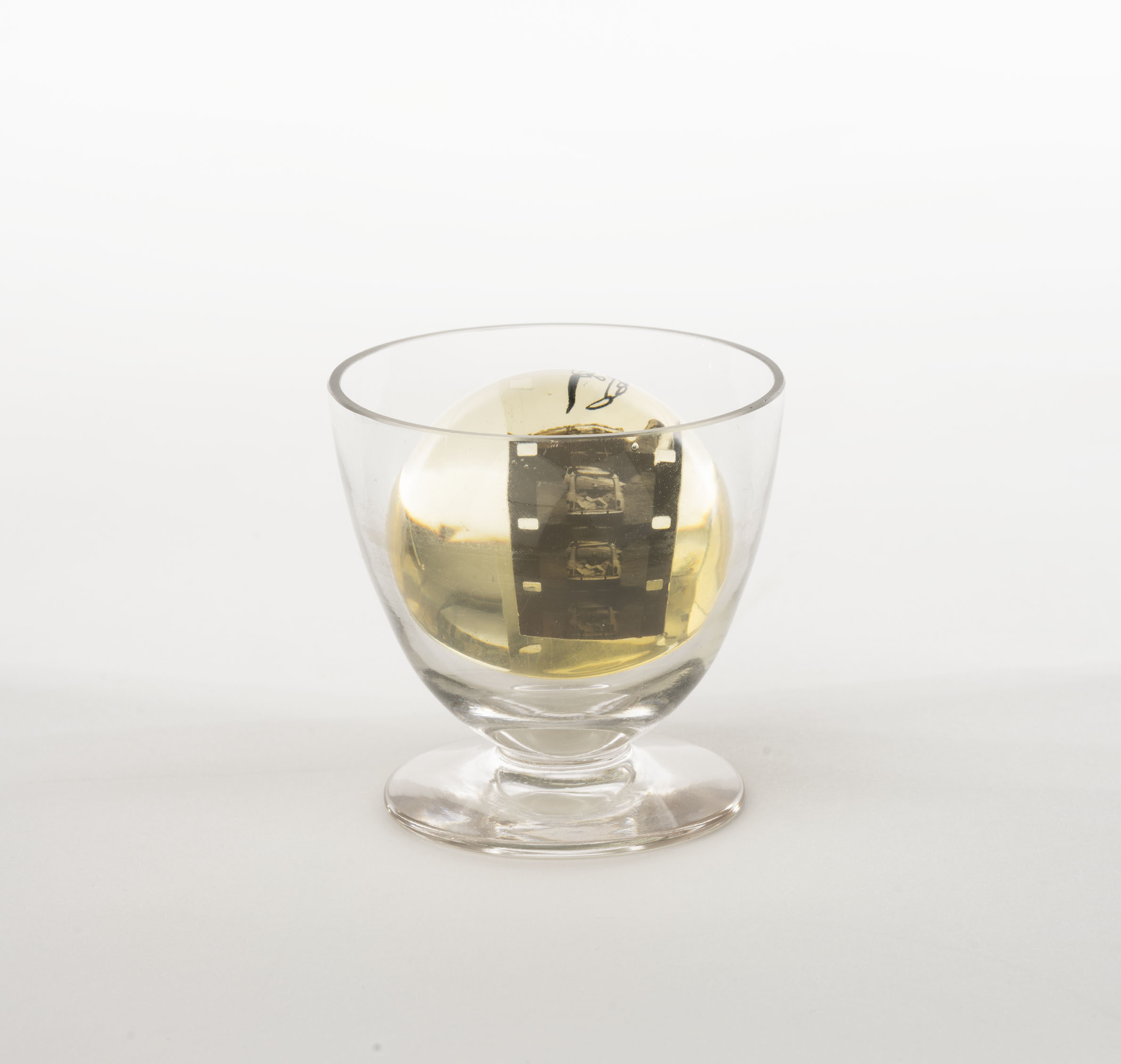 Cinc fotogrames de pel·lícula de 16 mm, quatre amb imatge real i un amb dibuix original, dins resina de polièster i copa de vidre