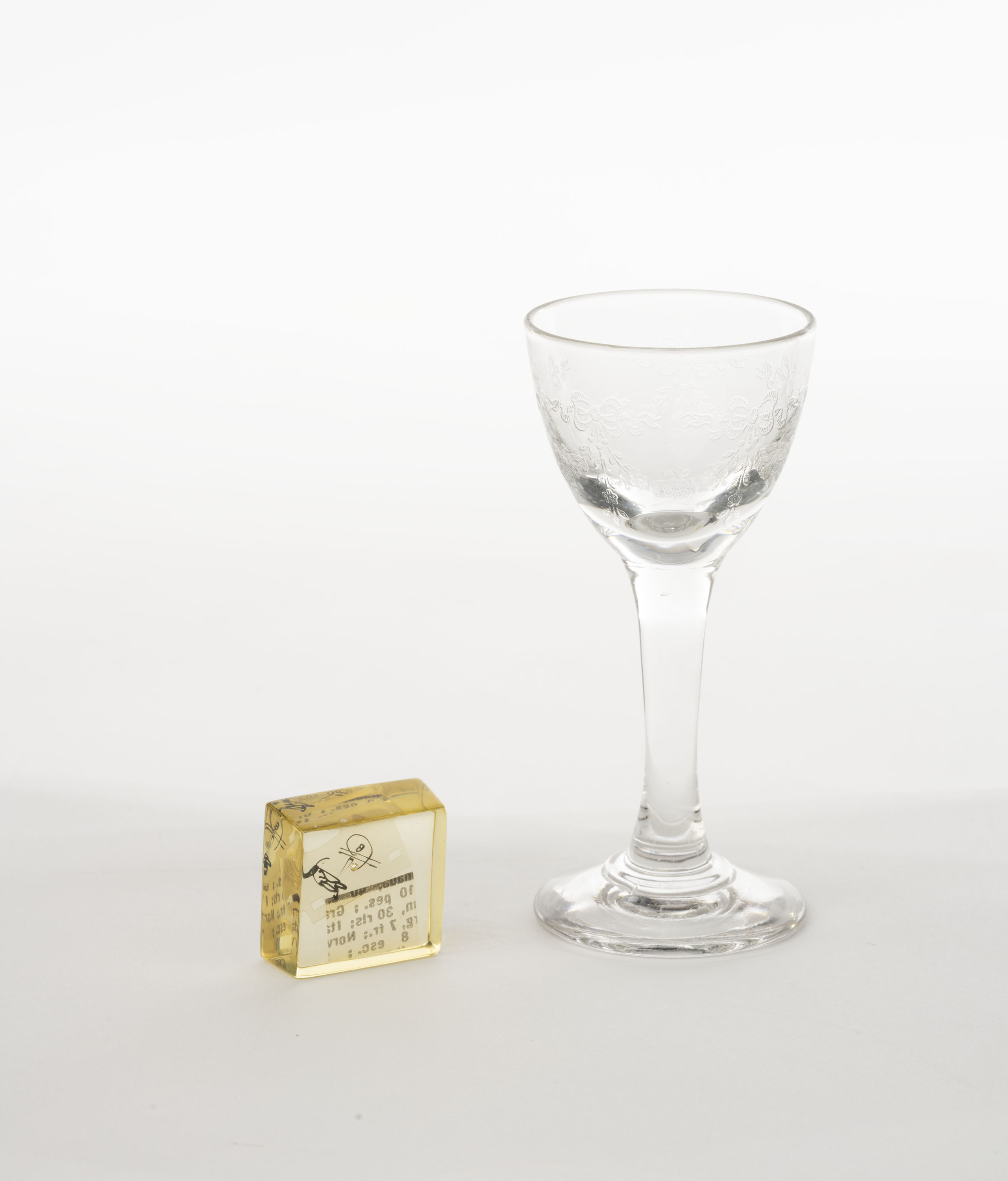Text imprès dins resina de polièster i copa de vidre