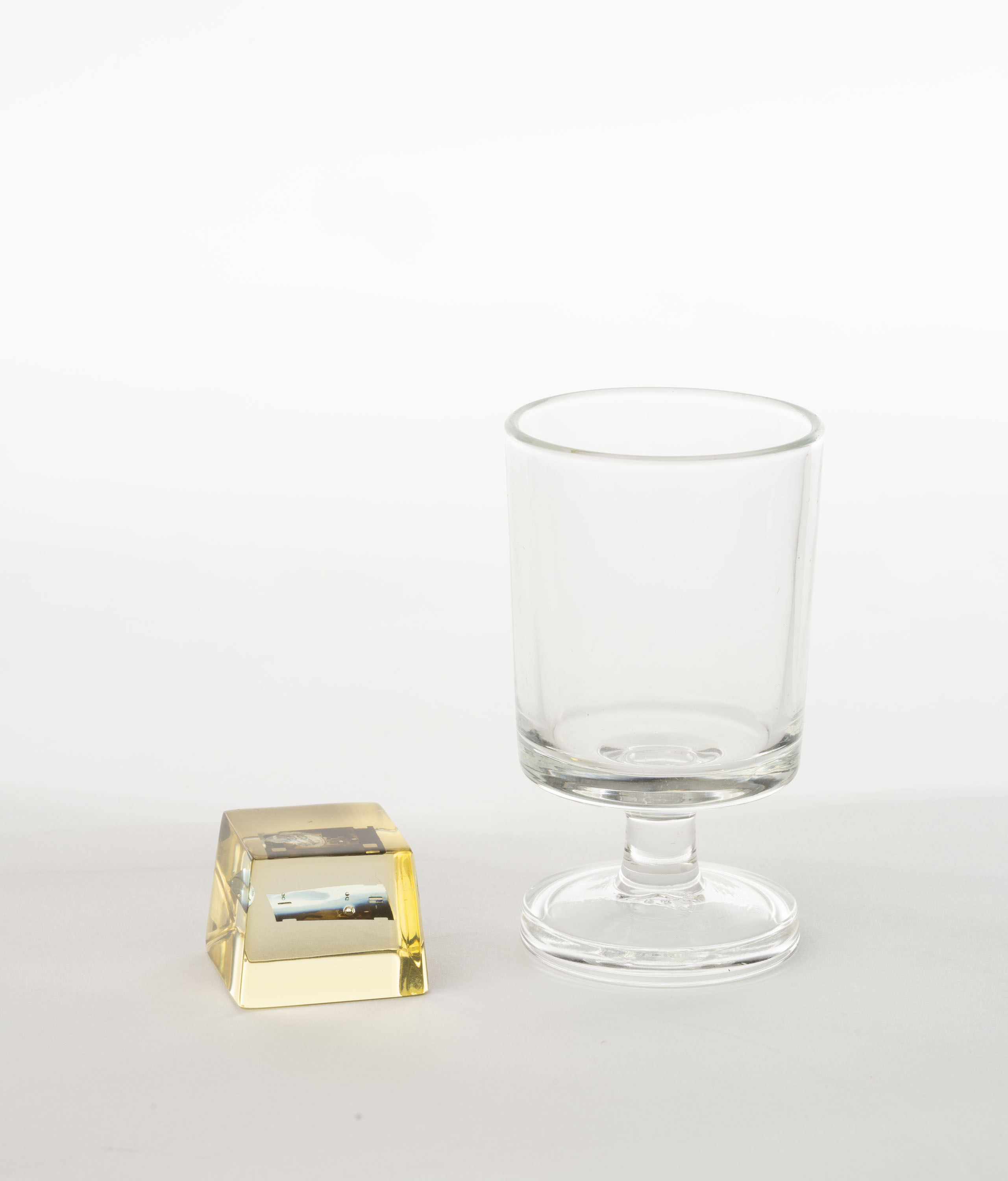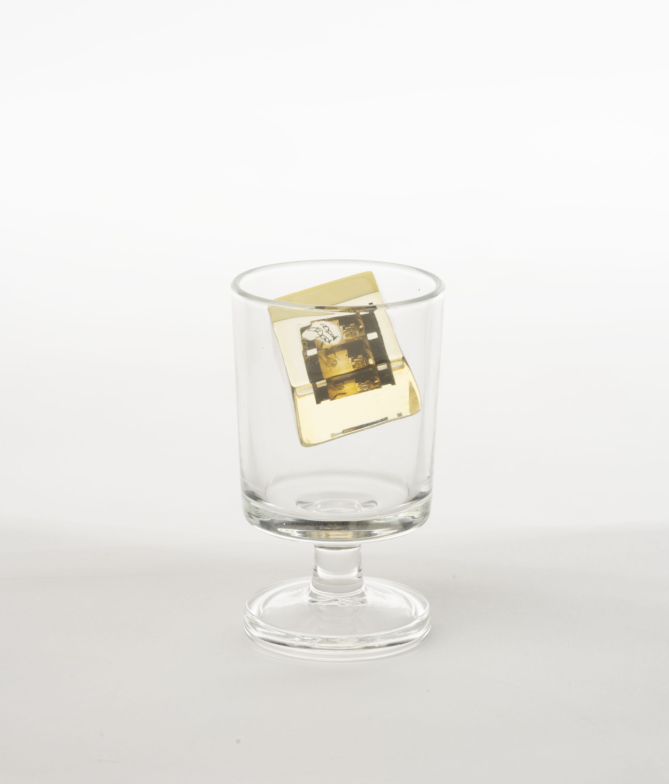 Dos fotogrames de pel·lícula de 16 mm amb dibuix original, dins resina de polièster i copa de vidre