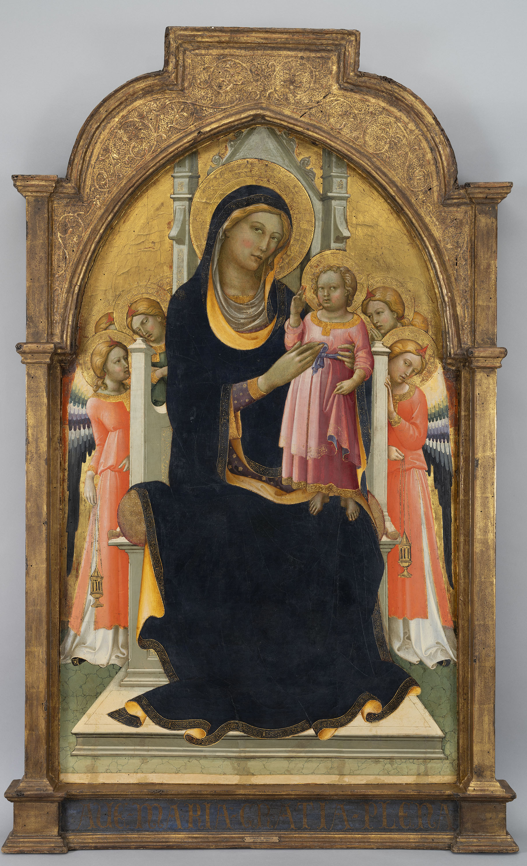 L'escena representa a la Mare de Déu asseguda en un tron, amb l'Infant dempeus a la seva falda i en actitud de beneir. Ambdós vesteixen de forma luxosa. Darrere seu hi ha sis àngels que duen encensers. La composició és senzilla, però mostra la fusió de la tradició pictòrica sienesa i florentina, pròpia de l'estil de Lorenzo Monaco, monjo de l'ordre camaldulenca en el convent de Santa Maria degli Angeli de Florència que va exercir gran influència sobre l'obra de Fra Angelico. Podria ser la taula central d'un políptic, que s'ha intentat reconstruir parcialment amb un "Sant Francesc" de col·lecció privada florentina a l'esquerra, i l'"Epifania" del Museu Narodowe de Poznam a la dreta.