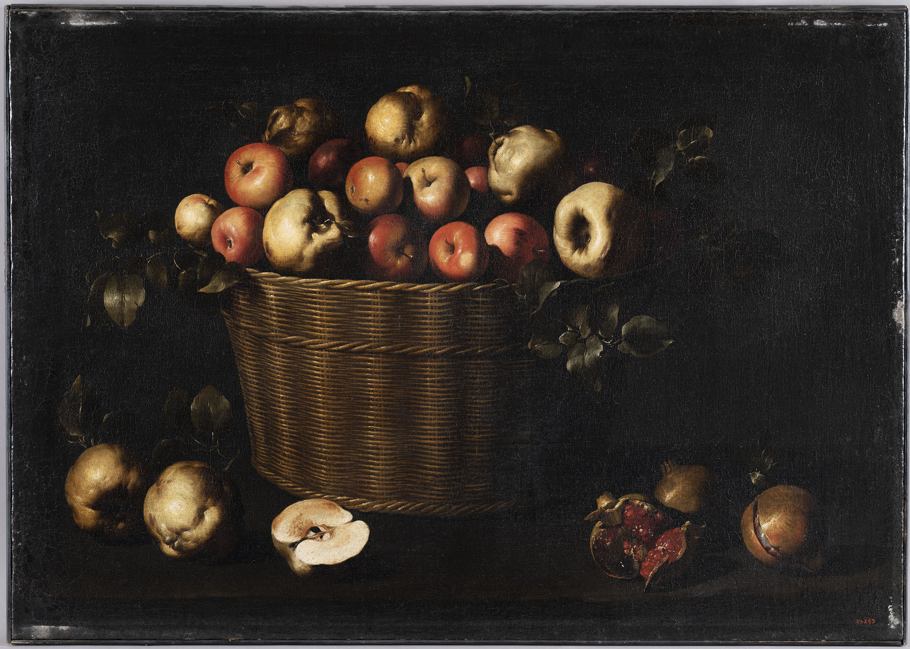 Com a la majoria de les natures mortes, la disposició de la cistella i els fruits sembla casual, però la composició està estudiada. Hi ha dos factors que hi incideixen. Un és relativament habitual: una cistella que domina l'eix del quadre. L'altre és més innovador: un fons obscur que contrasta amb la forta il·luminació i el color de la fruita i les fulles. Per les característiques formals, l'obra s'havia considerat pintada a Sevilla en la dècada dels anys 40 del segle XVII. L'atribució a Juan de Zurbarán es basa en les enormes analogies d'aquest quadre amb una altra natura morta conservada a Finlàndia, una de les úniques tres obres signades per l'artista.