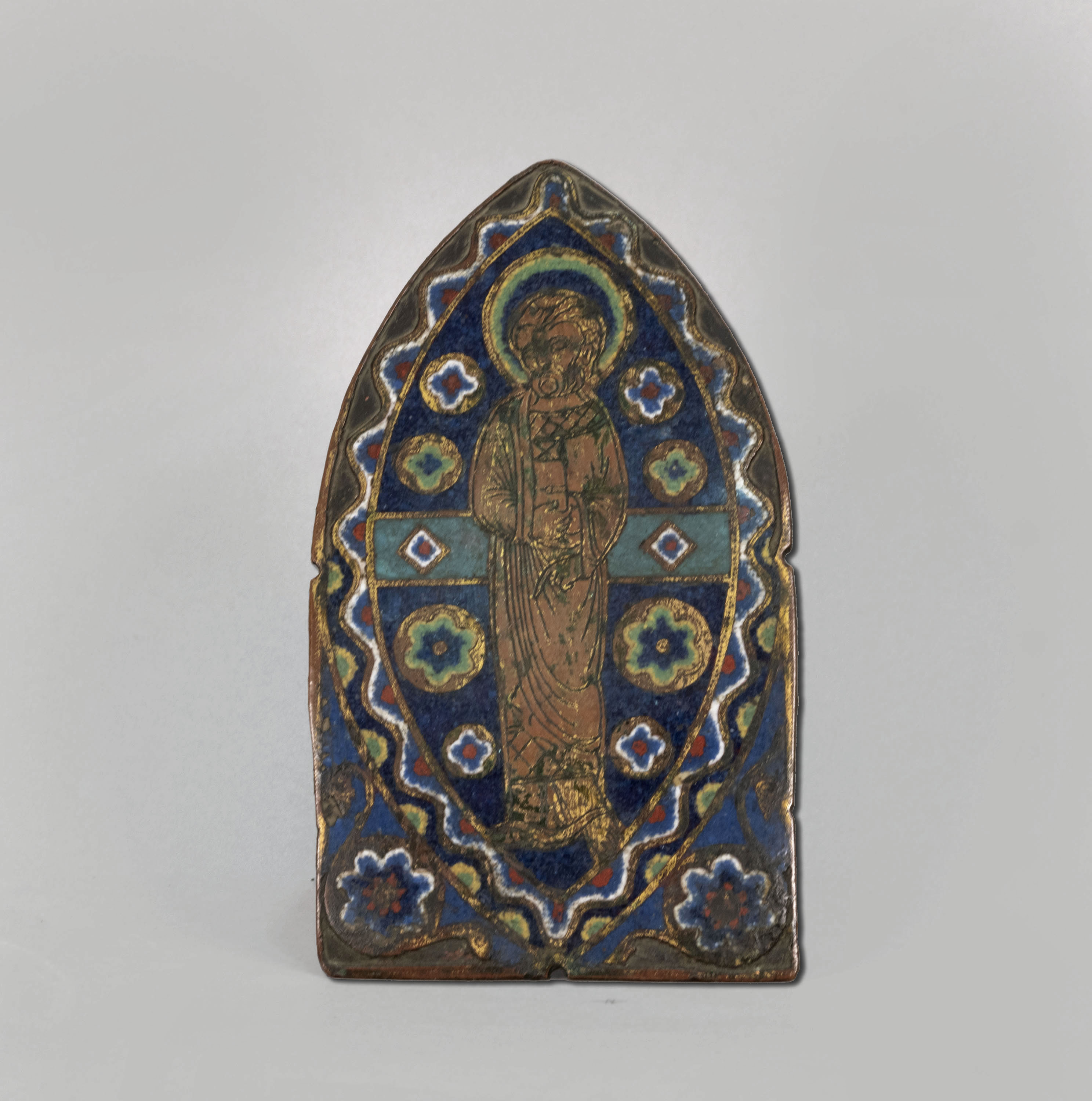 Coure daurat sobre ànima de fusta amb esmalt champlevé; Esmalt «champlevé»