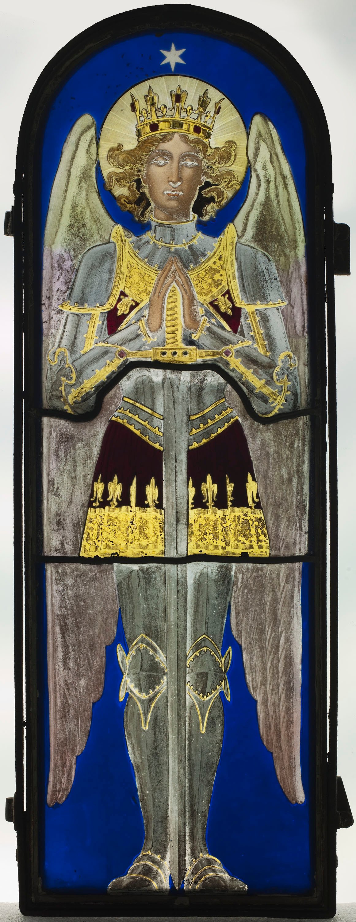 Vitrall emplomat, vidre plaqué rebaixat a l'àcid blau i vermell; grisalla, sanguina, groc d'argent i esmalt