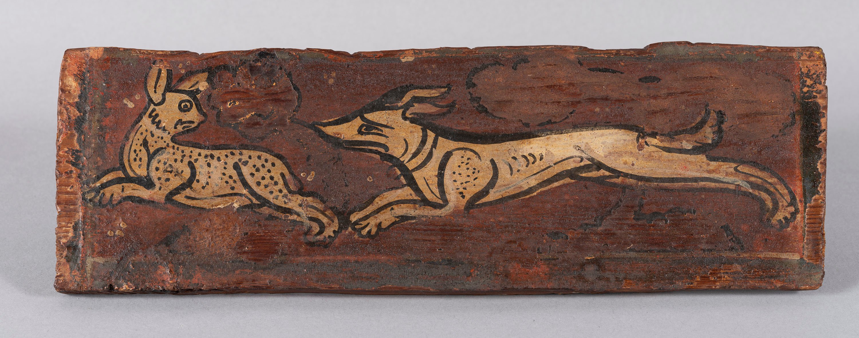 Tauleta d'enteixinat amb un gos perseguint una llebre