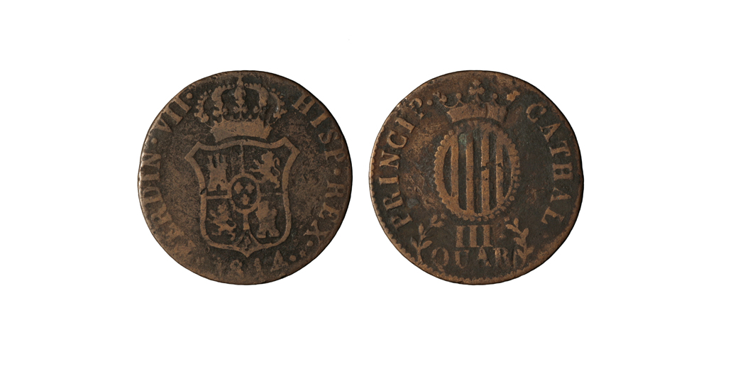 Crowned emblem of Catalonia, oval - below III. /QUAR., between two branches