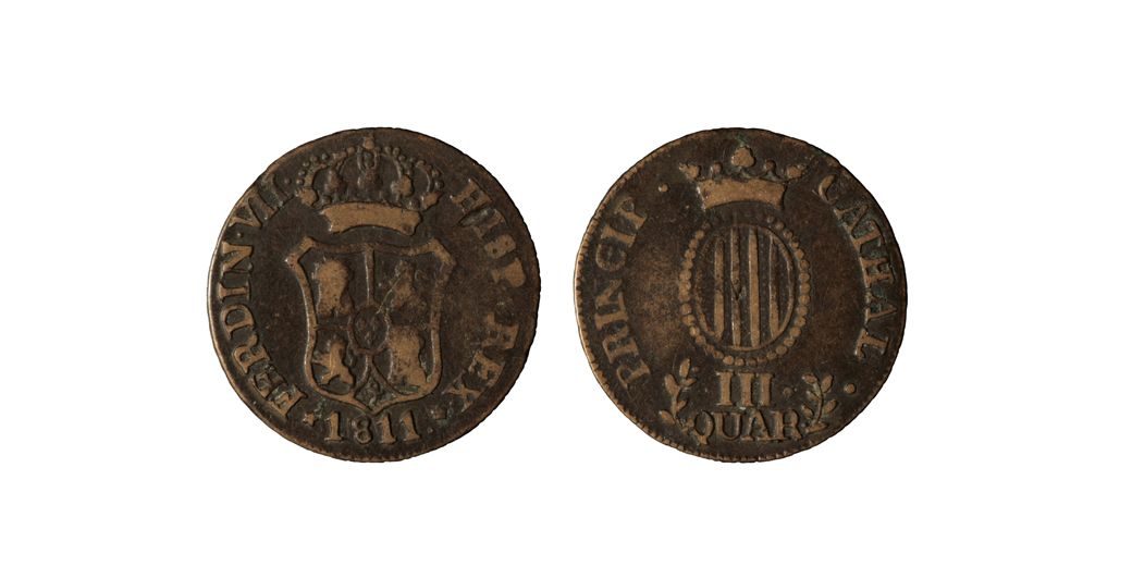Crowned emblem of Catalonia, oval - below III. /QUAR., between two branches