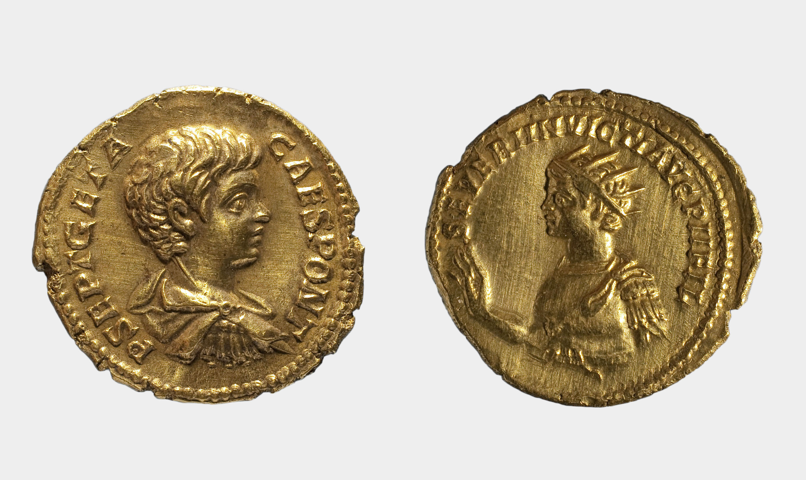 Bust de Caracalla (o de Sol),radiat, drapejat, cuirassat amb aegis (escut) i la ma dreta aixecada cap a l'esquerra.