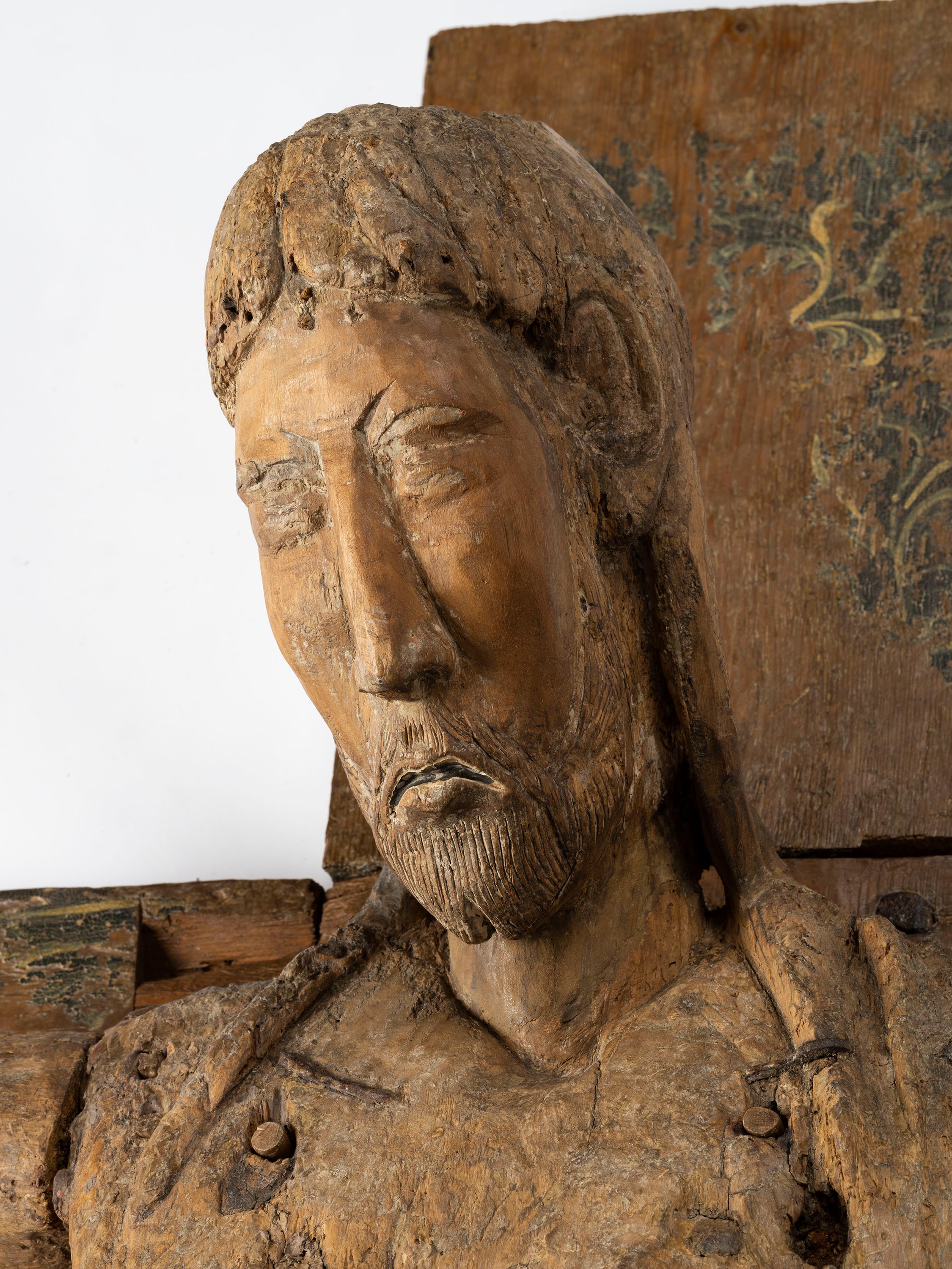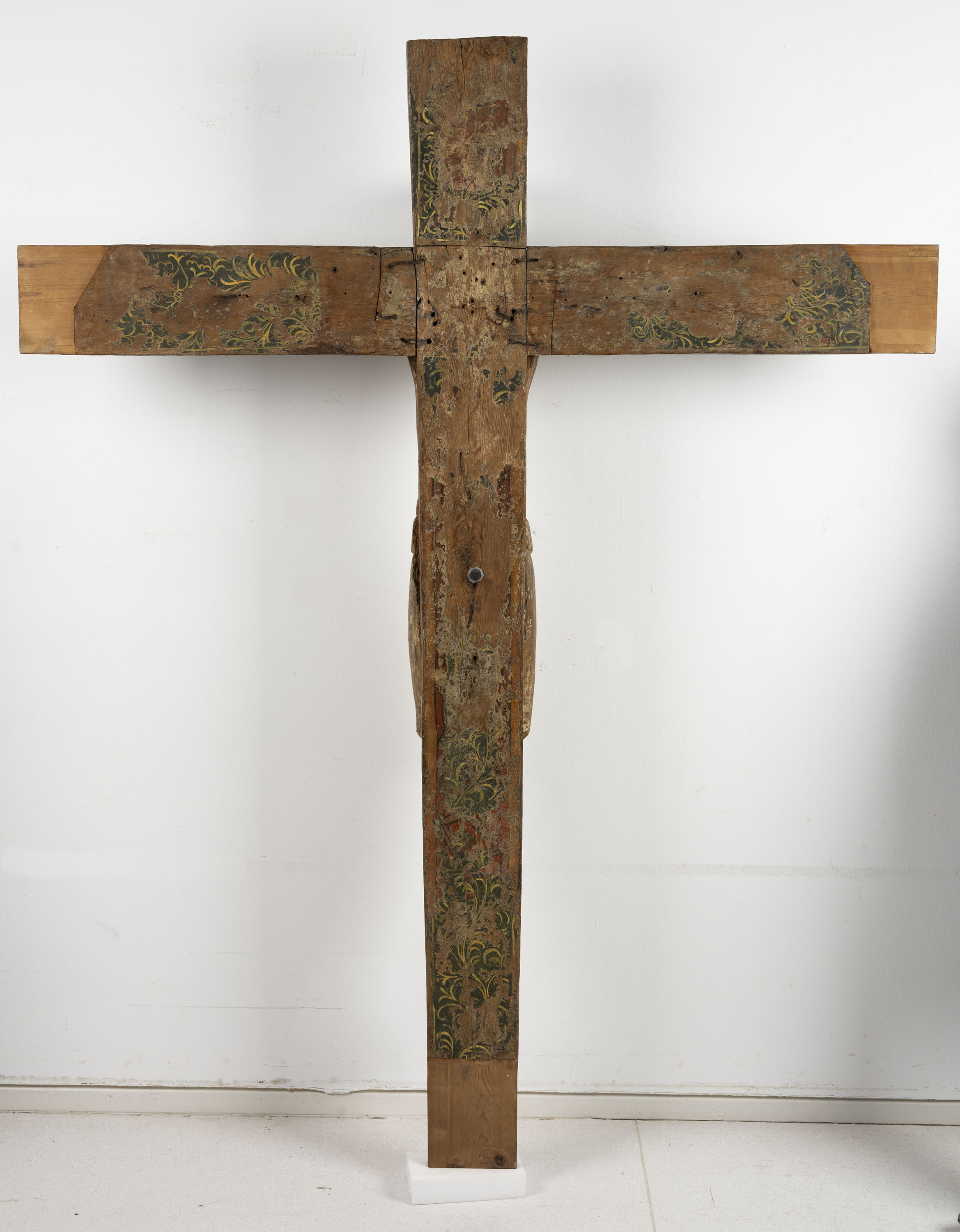 Talla en fusta de populus/salze (Crist) i pi (creu) amb restes de policromia al tremp.