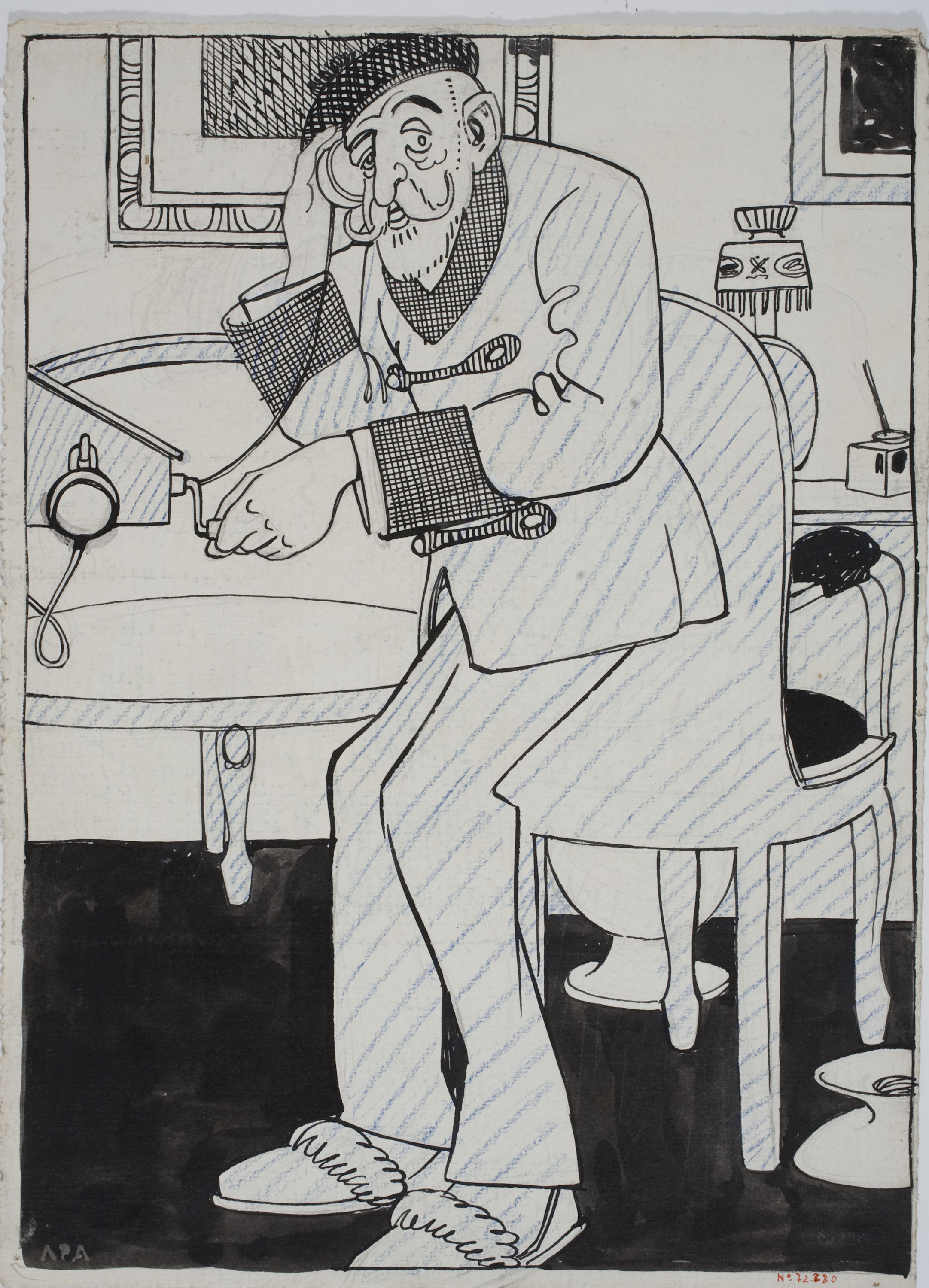 Ink and coloured pencil on paper