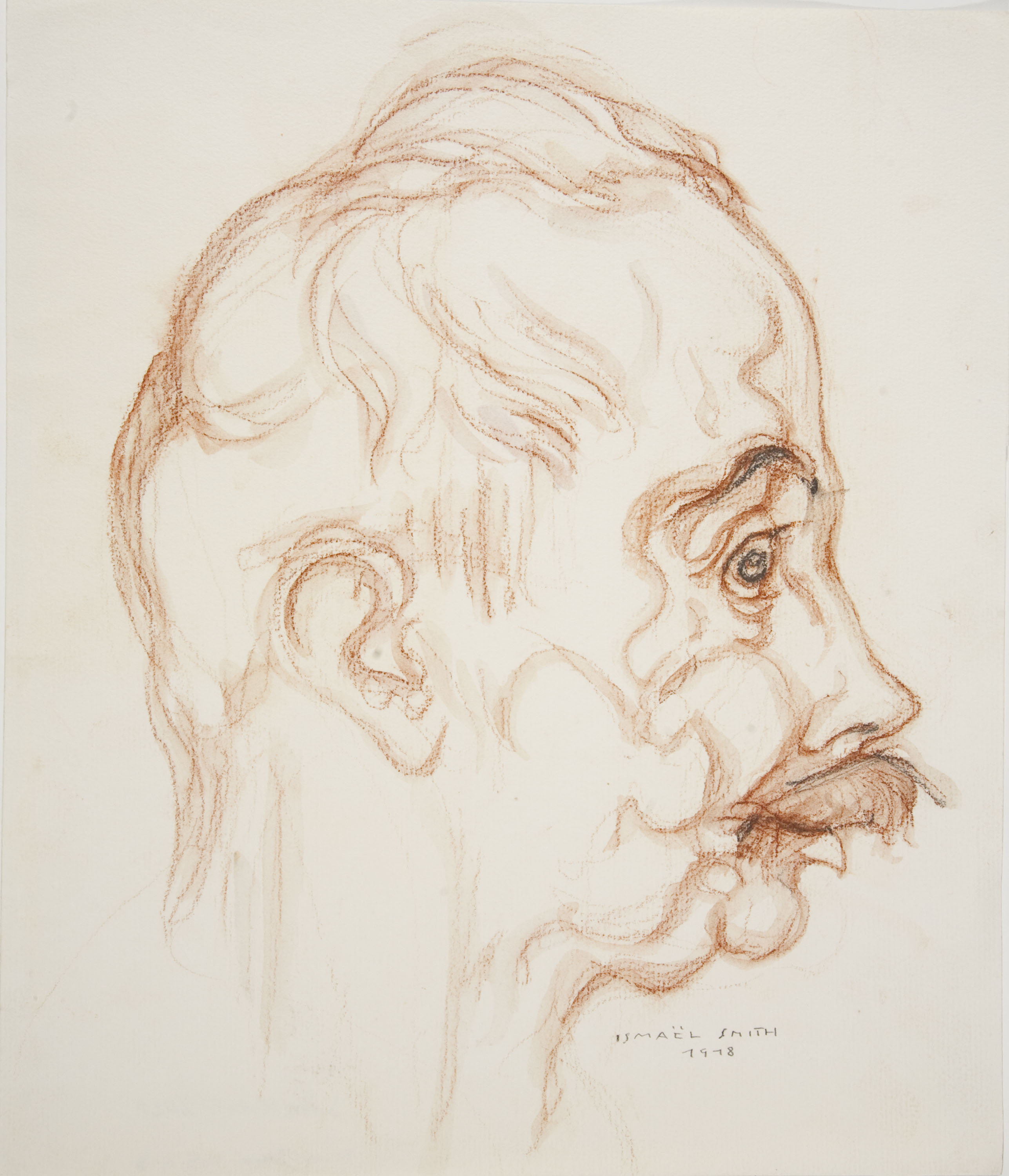 Graphite pencil, sanguine and watercolour on paper