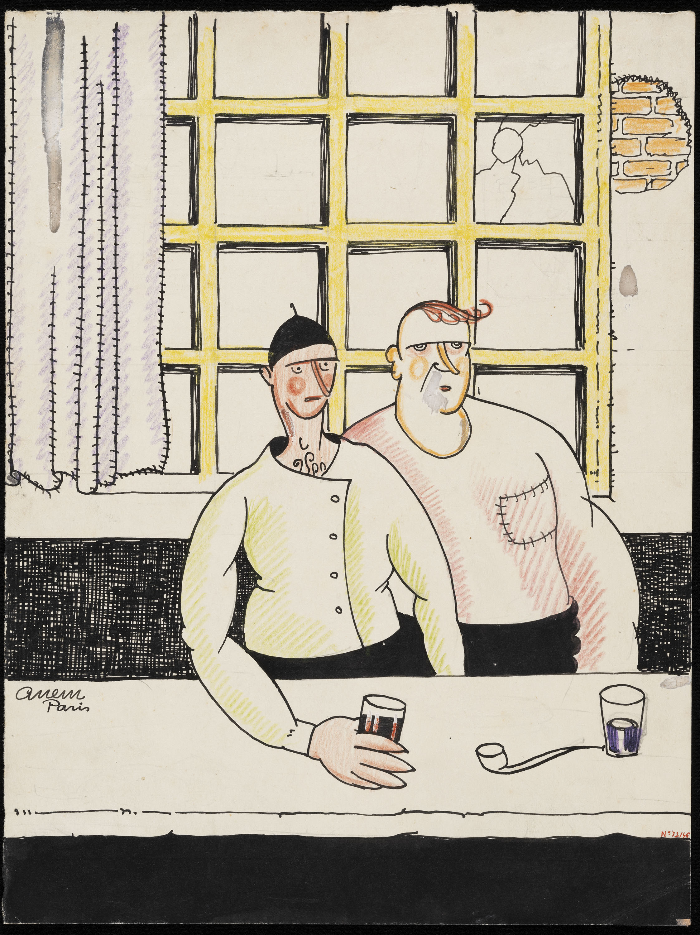 Ink and coloured pencil on paper