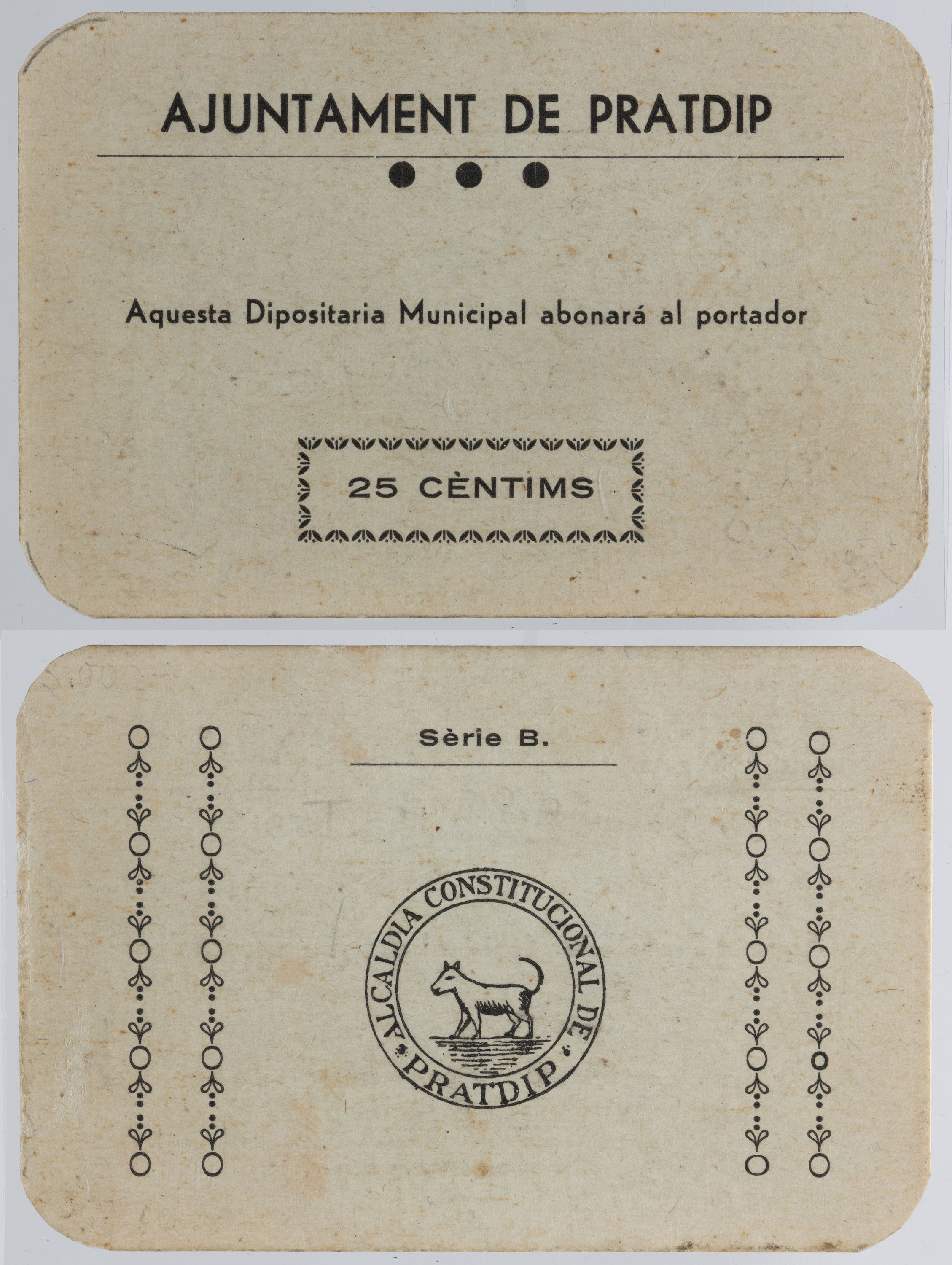 AJUNTAMENT DE PRATDIP / AQUESTA DIPOSITARIA MUNICIAPL ABONARÀ AL PORTADOR / 25 CÈNTIMS