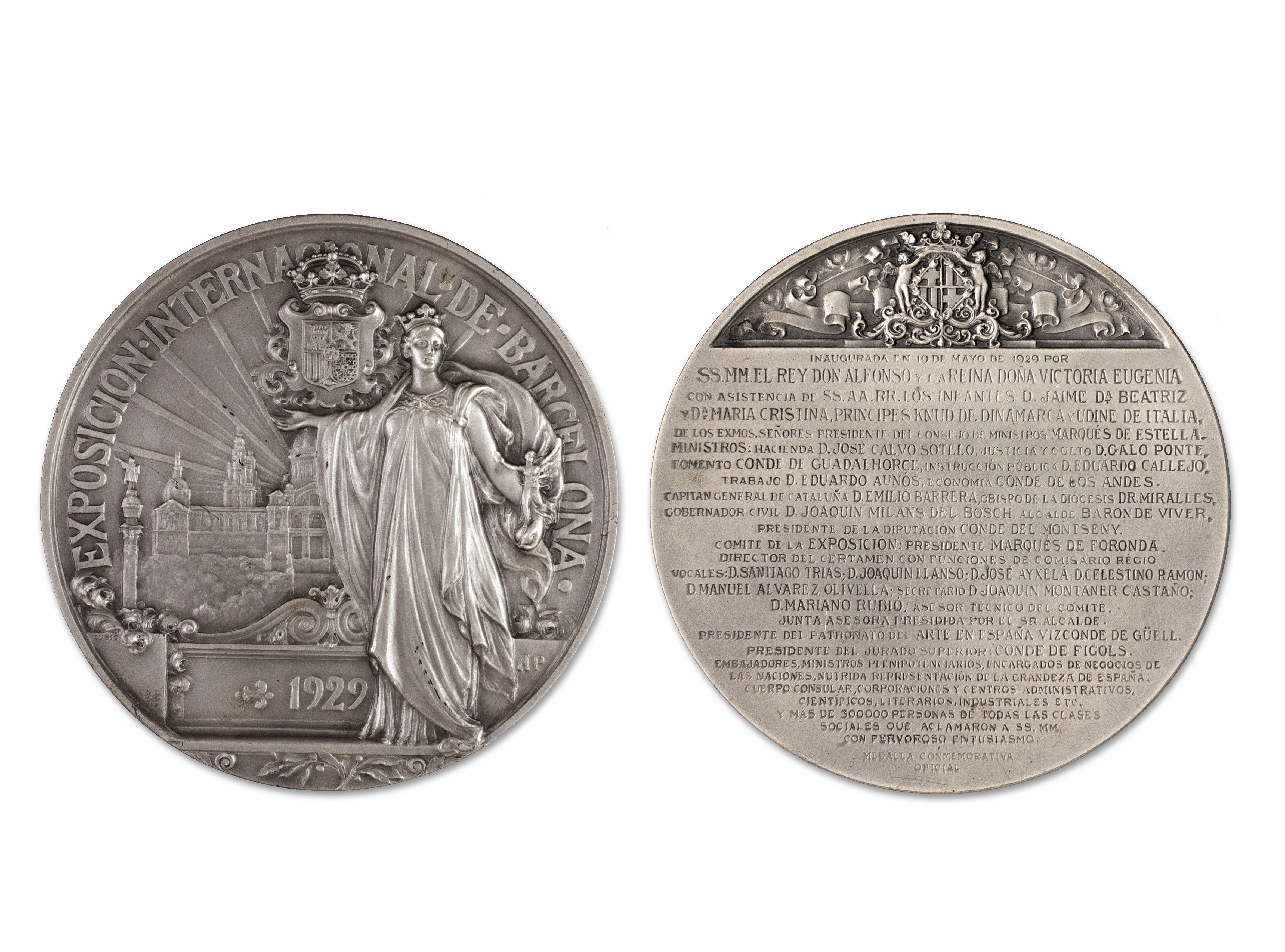 INAURADA EN 19 DE MAYO DE 1929 POR / SS.MM. EL REY DON ALFONSO Y LA REINA DOÑA VICTORIA EUGENIA / CON ASISTENCIA DE SS.AA.RR. LOS INFANTES D. JAIME Dª BEATRIZ/ Y Dª MARIA CRISTINA. PRINCIPEA KNUD DE DINAMARCA Y UDINE DE ITALIA, DE LOS EXMOS. SEÑORES PRESIDENTE DEL CONSEJO DE MINISTROS MARQUÉS DE LA ESTELLA. / MINISTROS: HACIENDA D. JOSÉ CALVO SOTELO, JUSTICIA Y CULTO D. GALO PONTE, FOMENTO CONDE DE GUADALHORCE, INSTRUCCIÓN PÚBLICA D. EDUARDO CALLEJO, / TRABAJO D. EDUARDO AUNOS, ECONOMIA CONDE DE LOS ANDES. / CAPIÁN GENERAL DE CATALUÑA D. EMILIO BARRERA, OBISPO DE LA DIÓCESIS DR. MIRALLES, / GOBERNADOR CIVIL D. JOAQUIN MILANS DEL BOSCH, ALCALDE BARON DE VIVER, PRESIDENTE DE LA DIPUTACIÓN CONDE DE MONTSENY. / COMITÉ DE LA EXPOSICIÓN: PRESIDENTE MARQUES DE FORONDA. / DIRECTOR DEL CERTAMEN CON FUNCIONES DE COMISARIO RÉGIO / VOCALES: D. SANTIAGO TRIAS - D. JOAQUIN LLANSO - D. JOSÉ AYXELA - D. CELESTINO RAMON - / D. MANUEL ÁLVAREZ OLIVELLA - SECRETARIO D. JOAQUIN MONTANER CASTAÑO - / D. MARIANO RUBIO, ASESOR TÉCNICO DEL COMIT´. / JUNTA ASESORA PRESIDIDA POR EL SR. ALCALDE / PRESIDENTE DEL PATRONATO DEL ARTE EN ESPAÑA VIZCONDE GÜELL. / EMBAJADORES, MINISTROS PLENIPOTENCIARIOS ENCARGADOS DE NEGOCIOS DE / CUERPO CONSULAR, CORPORACIONES Y CENTROS ADMINISTRATIVOS. / CIENTIFICOS, LITERARIOS, INDUSTRIASLES ETC. / Y MÁS DE 300000 PERSONAS DE TODAS CLASES / SOCIALES QUE ACLAMARON A SS.MM. CON FERVOROSO ENTUSIASMO/ MEDALLA CONMEMORATIVA / OFICIAL